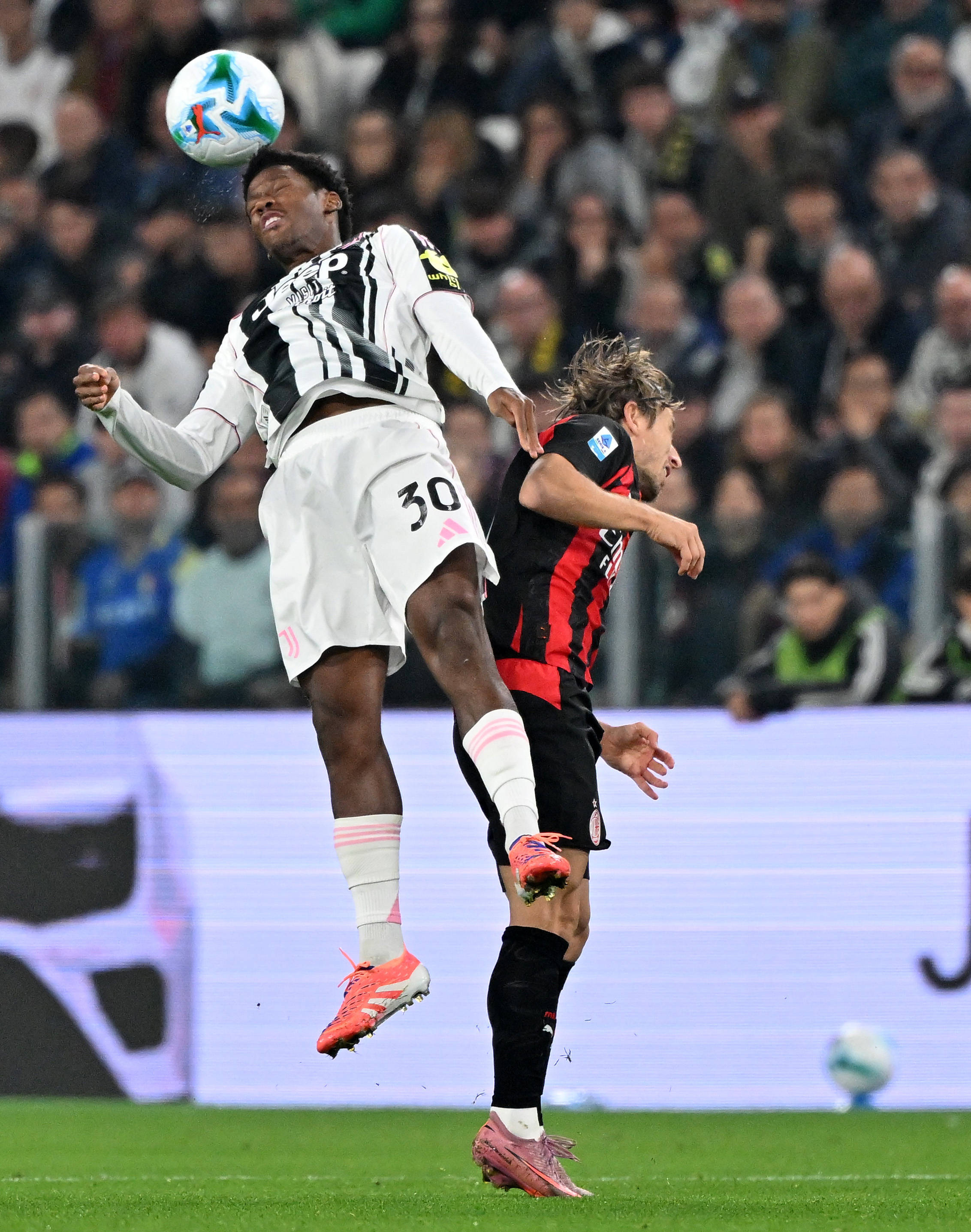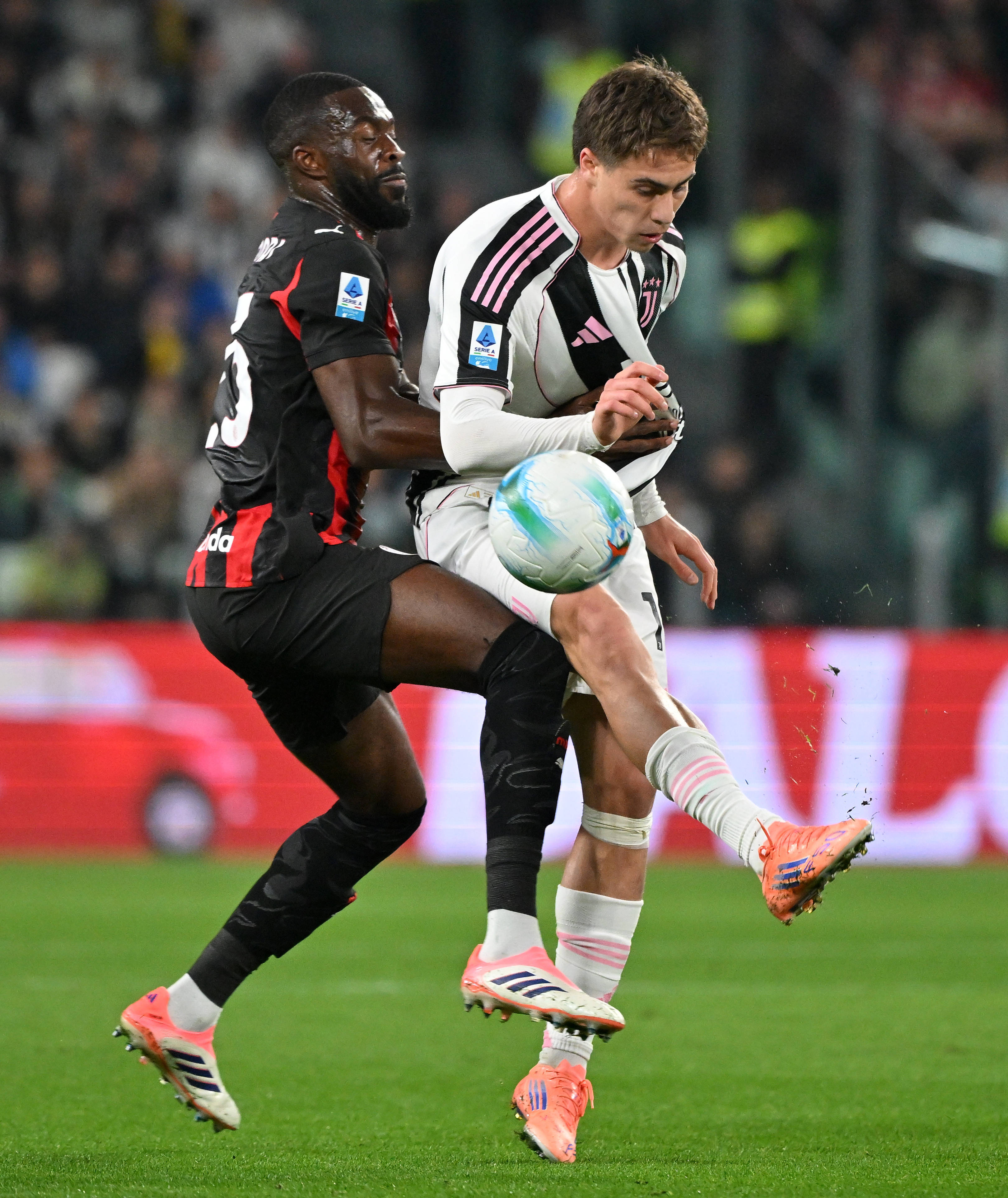 10月5日,尤文图斯队球员伊尔迪兹(右)与AC米兰队球员托莫里在比赛中拼抢。 新华社发(阿尔贝托·林格利亚摄)