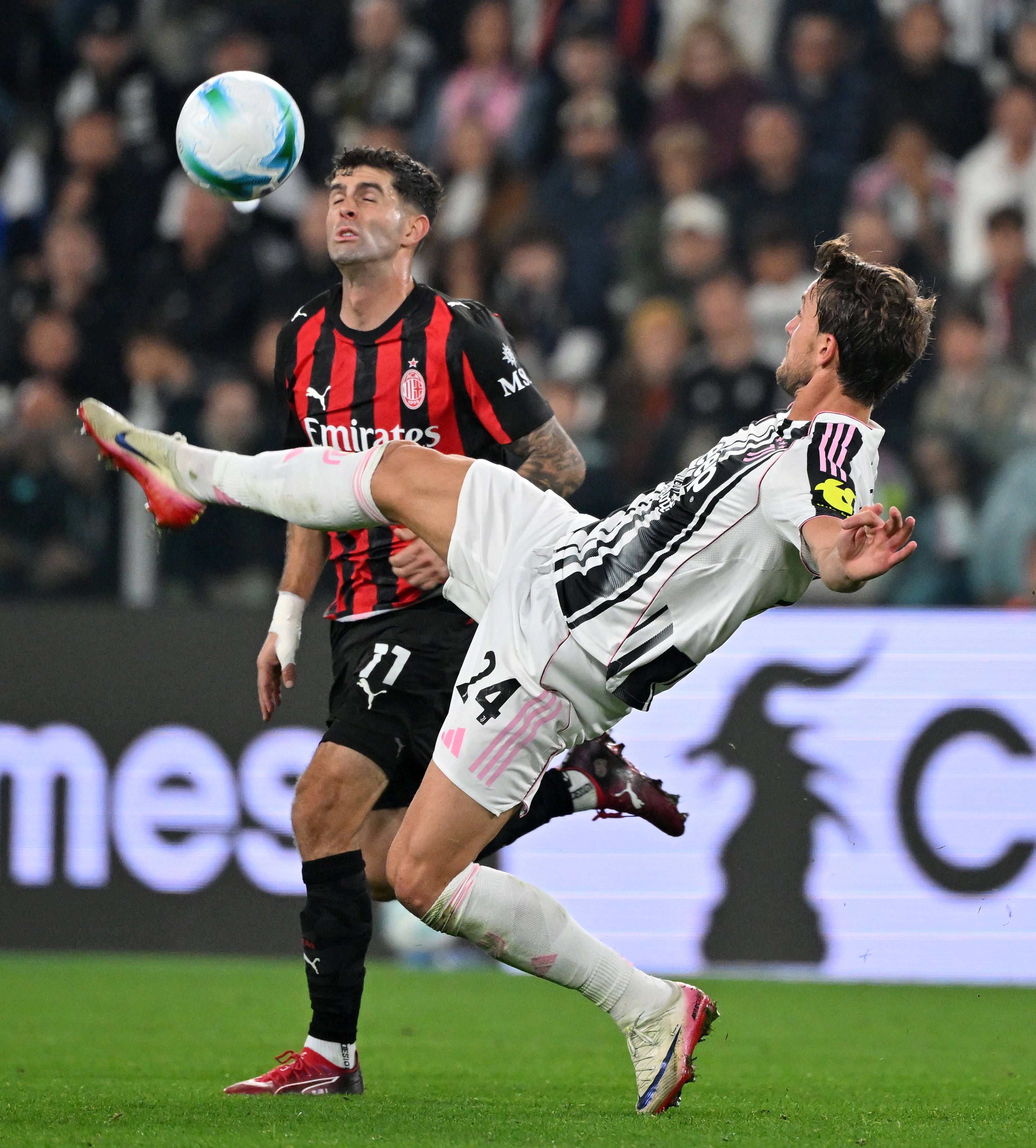 10月5日,尤文图斯队球员鲁加尼(右)与AC米兰队球员普利希奇在比赛中拼抢。 新华社发(阿尔贝托·林格利亚摄)