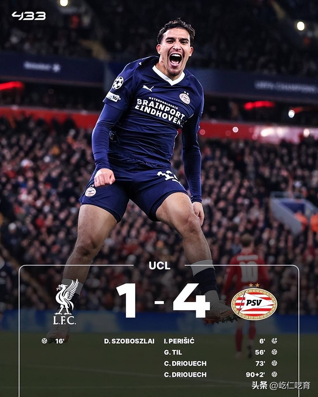 佩里西奇在第6分钟的进球,就帮助荷甲球队在客场先发制人,尽管索博斯洛伊在第16分钟完成了扳平,但并无更多进攻机会斩获的利物浦,到了下半场却被埃因霍温完胜--第56分蒂尔的进球和第73分钟和90 1分钟德里欧的梅开二度,直接帮助埃因霍温一举奠定了客场4-1的两球领先。