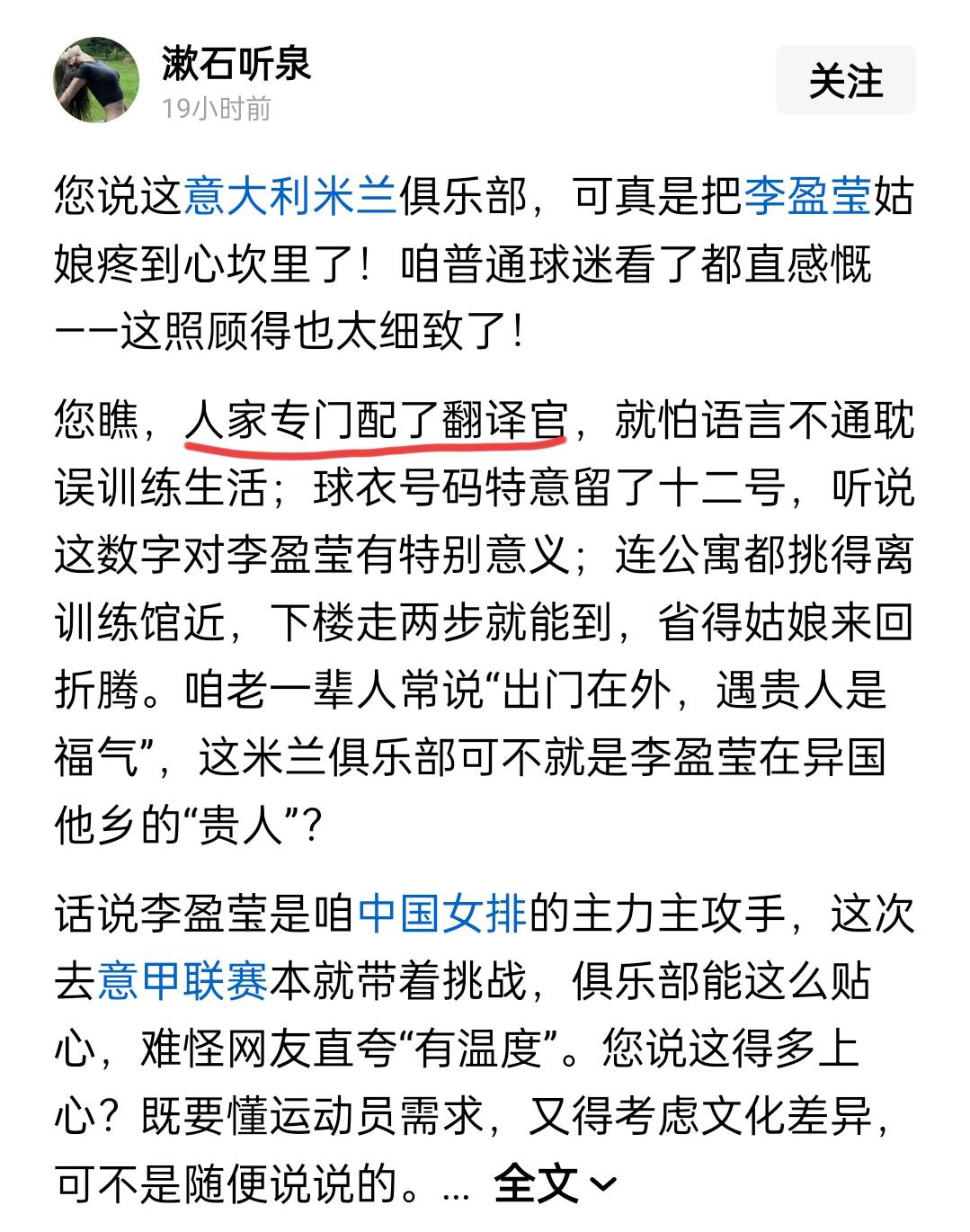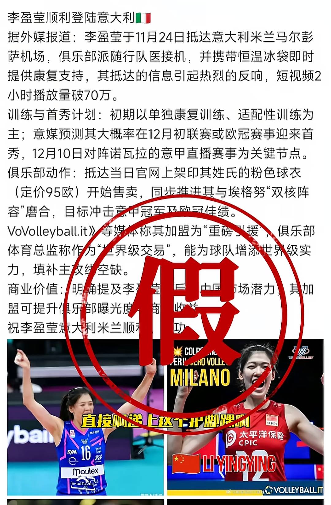 11月25日,天津电视台天视体育频道著名主持人、解说员孟繁达,在其个人社交媒体平台出来为李盈莹辟谣,全盘否定了关于各大平台传出的李盈莹留洋出国意大利的消息。同时他也表示,王媛媛出国留洋是11月25日启程,是真消息。笔者仔细看了关于李盈莹留洋的那些消息,主要来源于天津自媒体创作者和莹粉。这些人口口声声爱李盈莹,但是造李盈莹的谣,不知道出于什么目的呢?这样消费李盈莹是不是不妥呢?