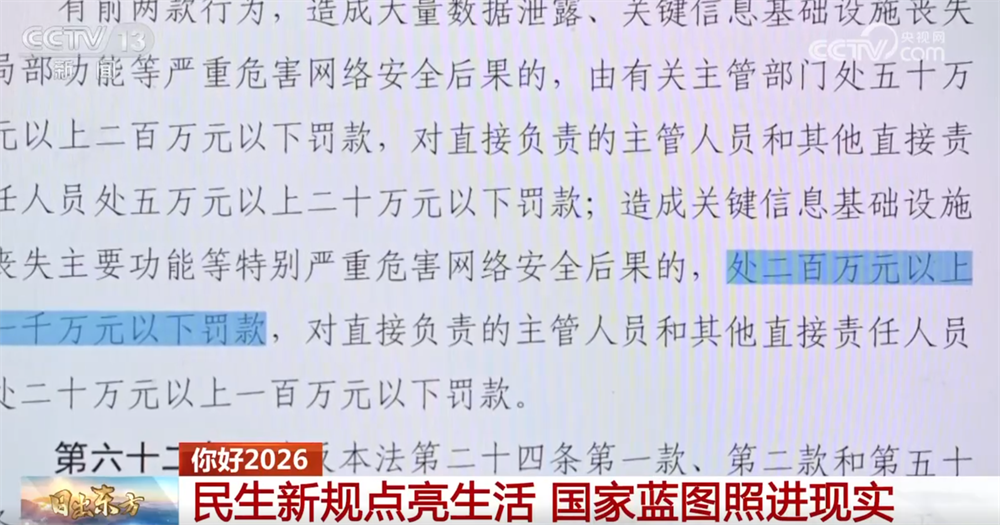 除此之外,我们从国家法律法规数据库中搜索发现,有200多条法律法规将在2026年生效。其中,新修订的《网络安全法》将从1月1日起正式施行,进一步强化了网络安全领域的法律责任,对相关运营者的行政处罚上限大幅提升至一千万元。还有不少地方特色法规,有的涉及家乡特产的保护发展,也有的加强你身边城市公园的建设。这些细微却具体的举措,正在悄然改善着我们生活的方方面面。