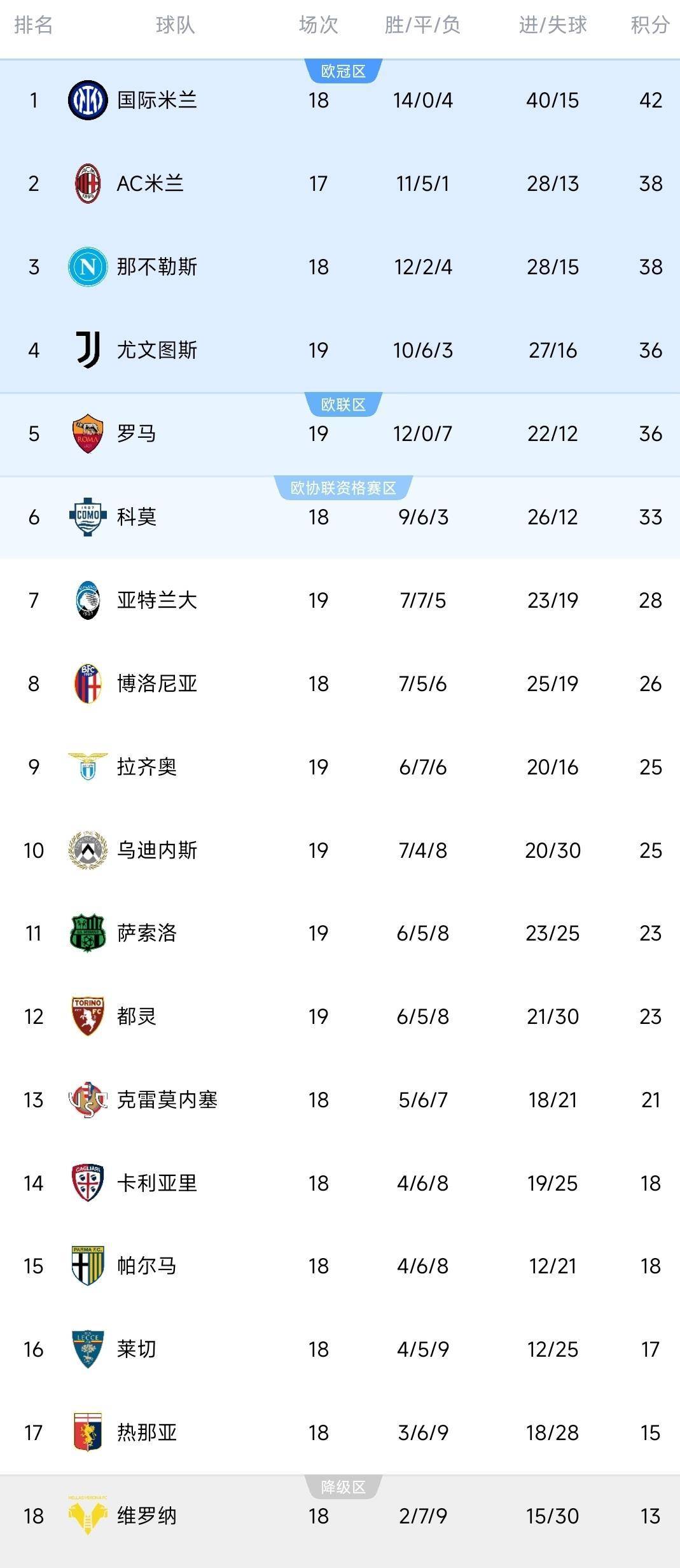 最受打击的是那不勒斯。 他们在多赛一场的情况下,战绩为12胜2平4负,积分同样为38分。 但由于净胜球或相互战绩的劣势,他们暂时排在AC米兰之后,位列第三。 更重要的是,他们错过了在直接争冠对手国际米兰身上缩小分差的黄金机会。