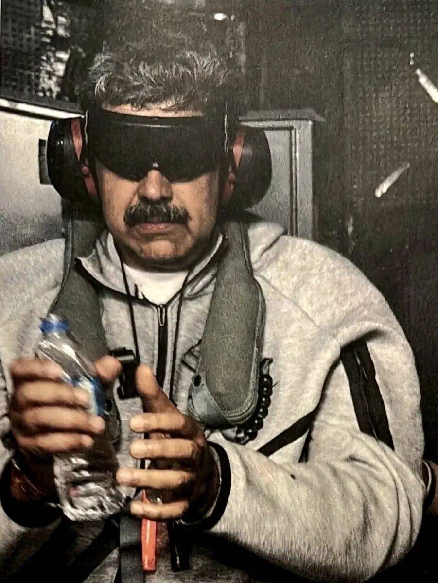 1月3日晚间,美国总统特朗普在X上发布了一张照片,画面中眼罩遮目、双手被拷的委内瑞拉总统马杜罗身着一套灰色Nike Tech Fleece运动套装,正乘坐“硫磺岛”号航空母舰,被押送纽约。美国单方面展开突击委内瑞拉的军事行动,逮捕了这位总统及其妻子。