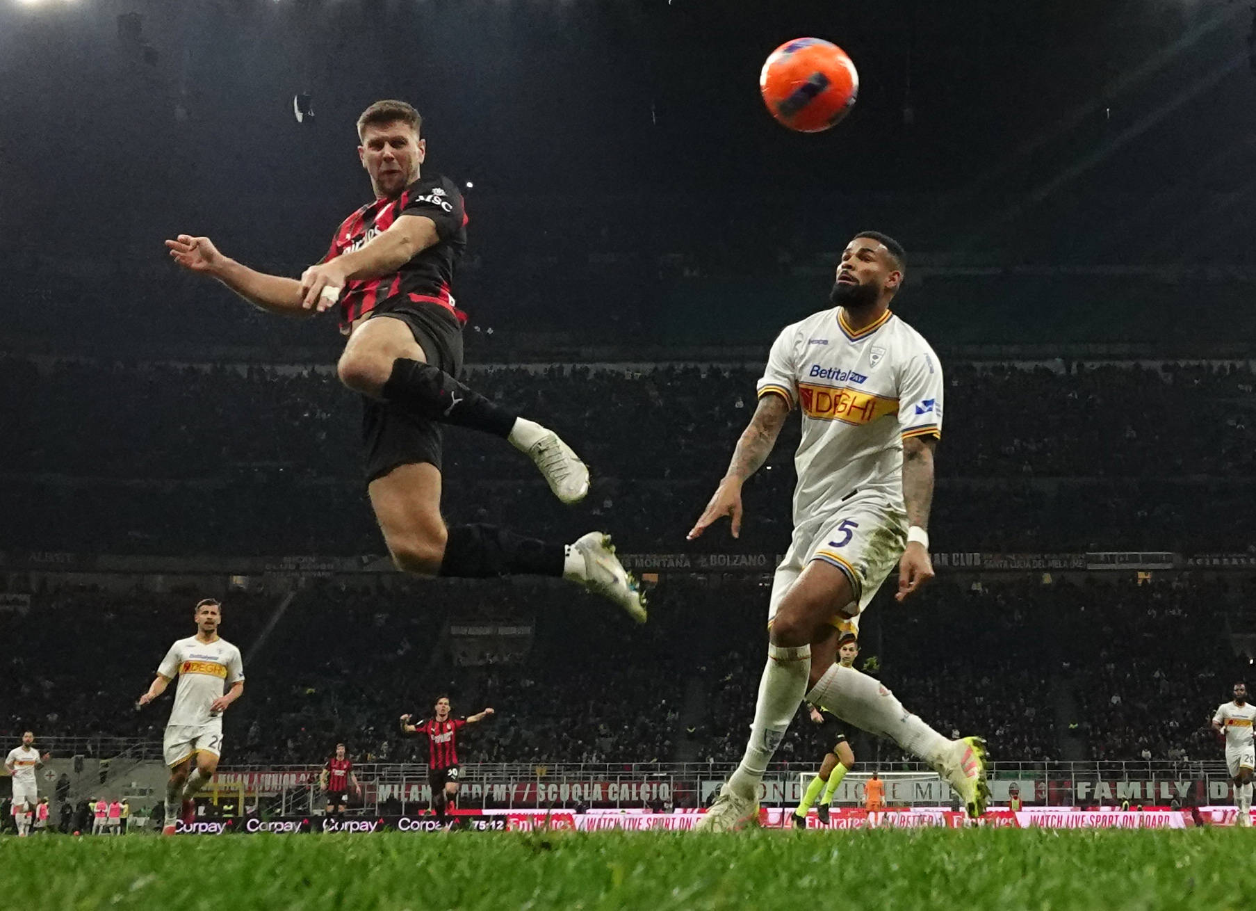 1月18日,AC米兰队球员菲尔克鲁格(左)头球攻门得分。 新华社发(阿尔贝托·林格利亚摄)