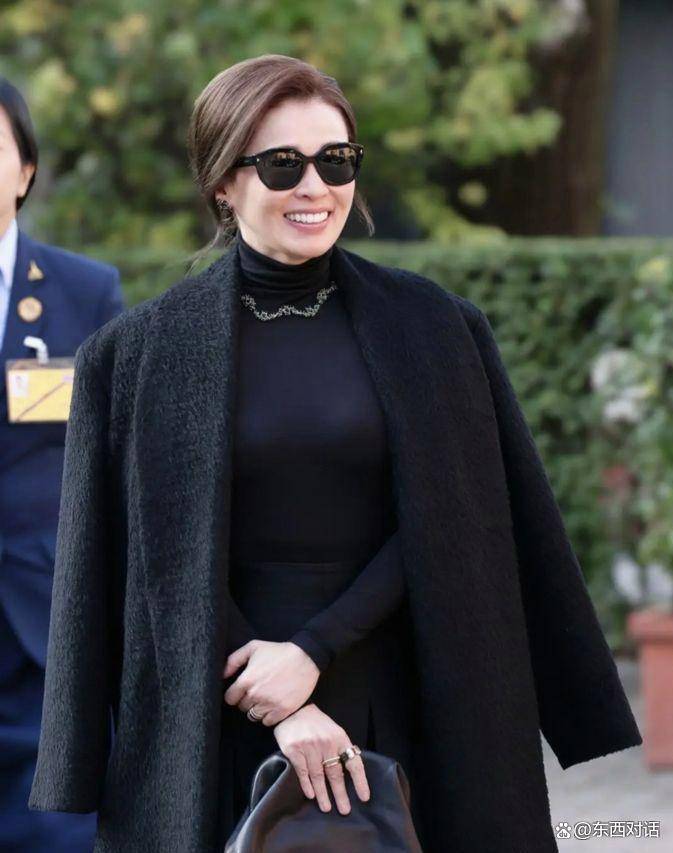 在位于科莫湖旁的科莫皇宫酒店举行的欢迎午宴上,苏提达王后换上了第二套更为精致的造型。 由于泰国仍处于诗丽吉王太后逝世后的国丧期,她延续了穿着深色服装的惯例。 她选择了一身全黑搭配:内里是修身的黑色高领针织衫和同色高腰伞裙,外面罩了一件剪裁精良的黑色短绒面料长大衣。 大衣的廓形宽松,披在肩上时形成了强大的气场。 而整套装扮中最夺目的焦点,是她颈间那条首次亮相的钻石项链。