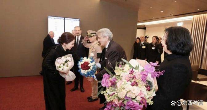 苏提达王后对大型外交场合的着装驾驭能力,早有先例。 2025年11月,她陪同泰王玛哈对中国进行国事访问时,其服装就被誉为“外交穿搭范本”。 抵达北京时,她身穿高级灰色千鸟格套裙,优雅得体;在人民大会堂出席正式活动时,她换上了深蓝色镶金边的泰式公务装,庄重专业;而在盛大的国宴上,她一袭黑金配色的传统泰服,佩戴全套祖母绿珠宝,尽显王室威仪。 每一次亮相的服装都严格对应场合的礼仪要求,同时巧妙地融入泰国民族文化元素,展现了其背后团队的精心筹备与她个人的极高审美。