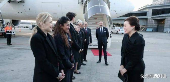 苏提达王后抵达米兰马尔彭萨机场时,身穿一套打破王室常规的出行装。 她没有选择标志性的泰式礼服或严肃的套装,而是以一件黑色波点上衣搭配高腰阔腿裤亮相,显得轻松又时髦。 然而,整套造型的灵魂在于她肩头那条随意披挂的黑色真丝雪纺长巾。 这条披肩并非规整地穿戴,而是以一种看似不经意的方式斜搭着,随着她的步伐和微风轻轻拂动,瞬间柔化了黑色带来的正式感,增添了几分灵动与飘逸。