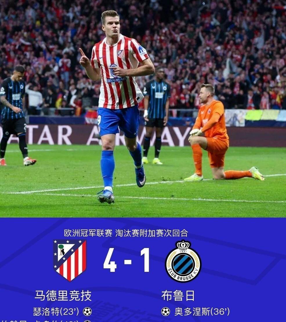 在马德里万达大都会球场,马德里竞技主场4-1大胜布鲁日,以总比分7-4强势晋级。